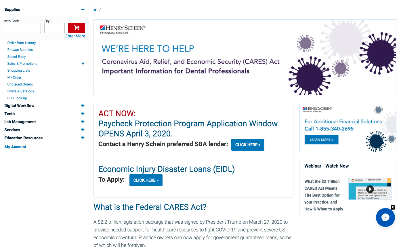 Henry Schein has developed a CARES Act Landing page to help dental professionals access the help they need during the COVID-19 pandemic.