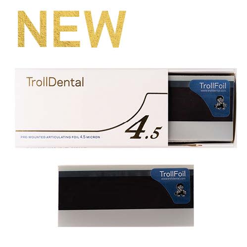 TrollFoil 4.5 is the newest addition to the TrollFoil product line. At 4.5 microns thin it is the thinnest articulating product on the market. Research shows the thinner the articulating Foil the better, especially when you need to fine tune that one little spot that the patient feels, but you cannot get with your normal articulating product. Your adjustments are precise instead of grinding all over the place. It is the perfect product to make getting those hard to dial in bites fast and easy.