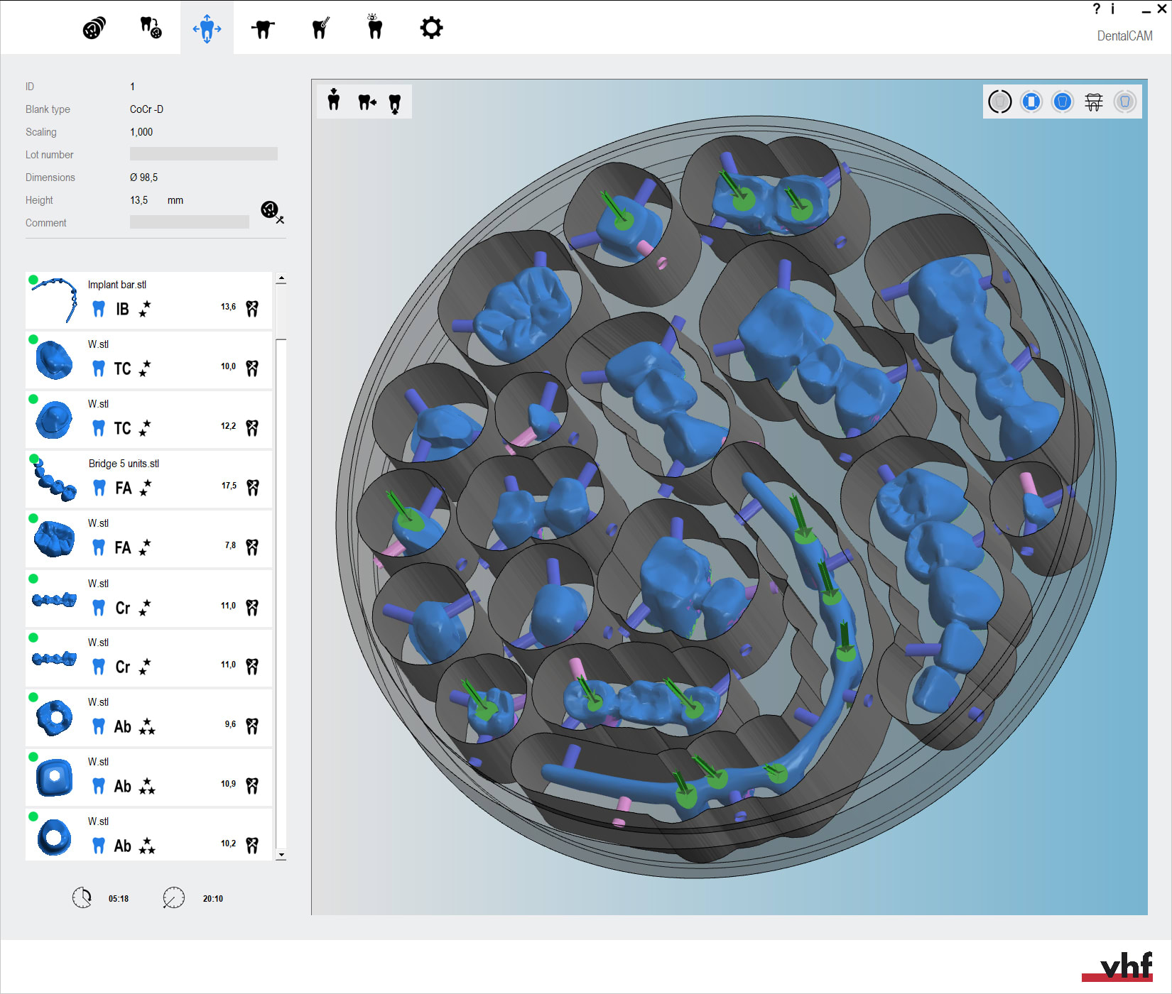 The vhf software developers were able to accelerate the already fast machining speeds of DENTALCAM 7 considerably again, thanks to new machining strategies. A significant time saving of up to 30 % is achieved when milling zirconia and PMMA. On top of that, the grinding times on the R5 and N4+ could also be improved by up to 30 %. And last but not least, the working efficiency could be further increased, due to up to 50 % quicker data import which makes nesting faster.