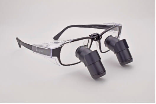 These loupes come in the magnifications 3.5x and soon 4.5x (5.5x and 6.5x to come at a later date). The pantoscopic tilt of the lens helps to eliminate gaps between the face and bottom edges of the lens for better eye protection and wider direct view of work area when looking below the loupes. The rigid and lightweight titanium frames also help keep the optics precisely aligned.