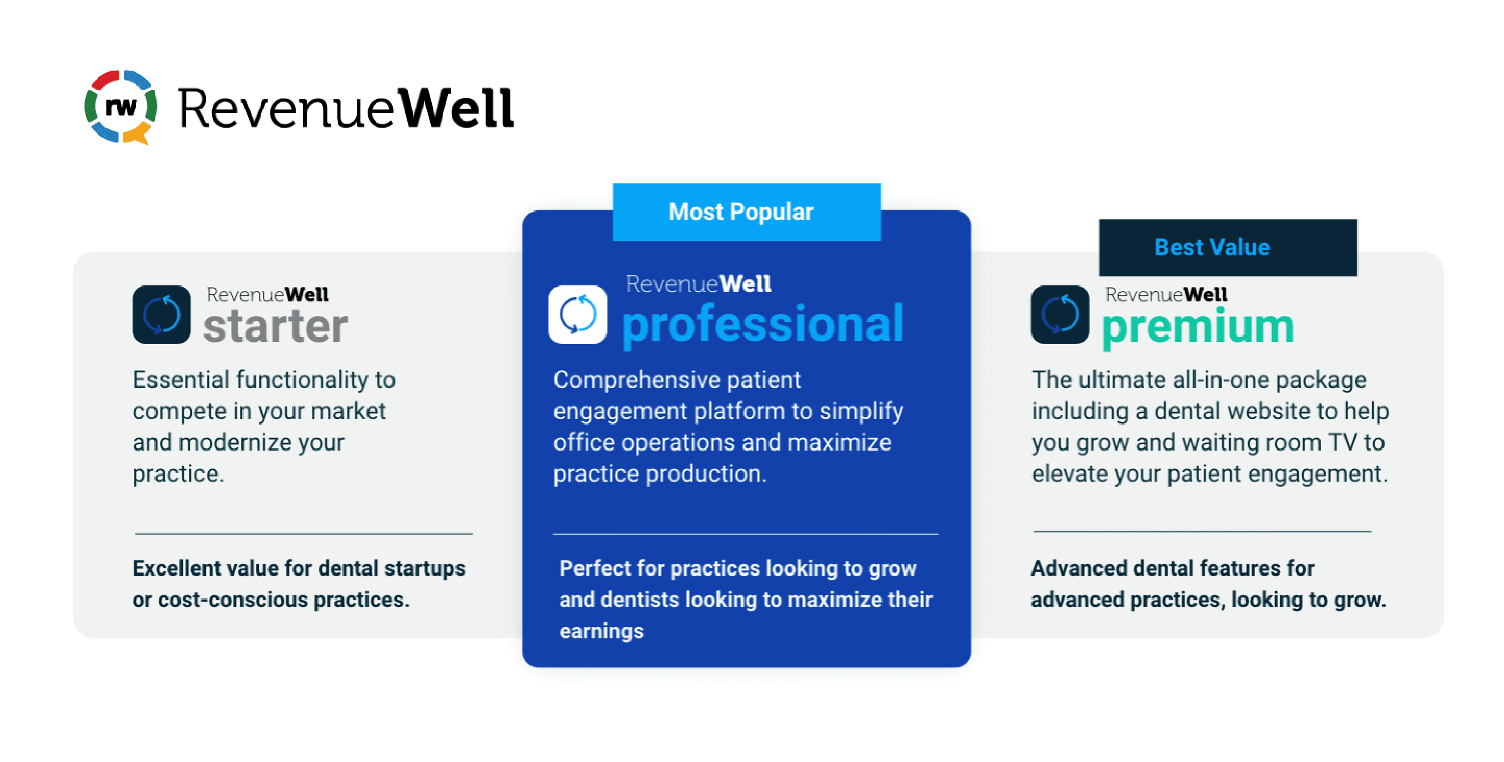 RevenueWell, the leading patient engagement provider for the dental industry, is proud to announce the availability of three innovative integrated product bundles: RevenueWell Starter, RevenueWell Professional, and RevenueWell Premium. These bundles are designed to provide maximum value at reduced costs, while catering to the unique requirements of dental practices at every stage of business maturity. With a focus on simplifying operations and enhancing practice efficiency, the new RevenueWell bundles empower dental practices with tailored solutions that align with their specific needs.