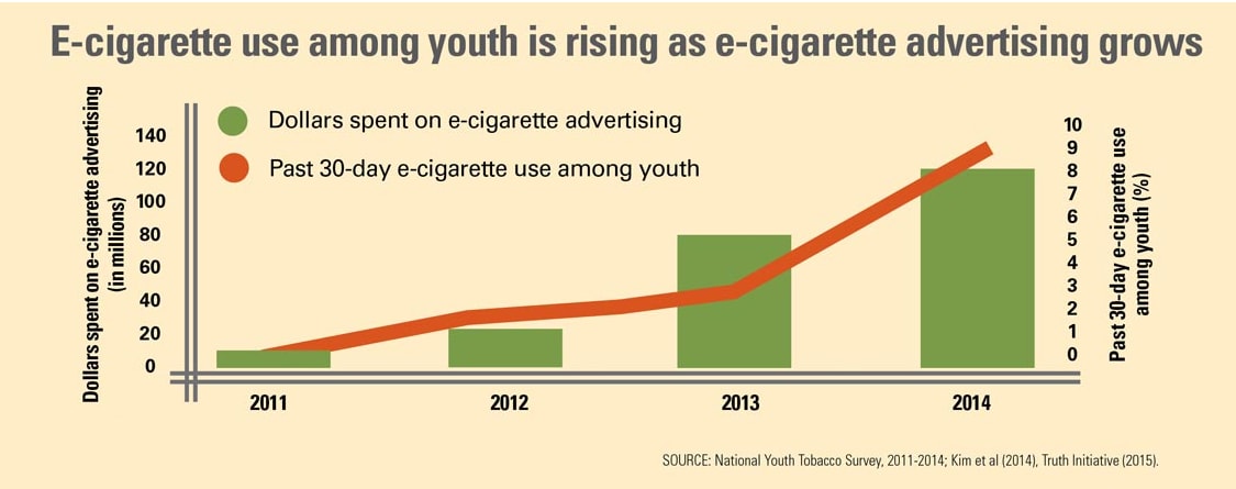 E-cigarettes typically deliver nicotine, which at a young age may cause lasting harm to brain development, promote addiction, and lead to sustained tobacco use. In 2014, e-cigarettes became the most commonly used tobacco product among youth, surpassing conventional cigarettes. During 2011 to 2014, current e-cigarette use among high school students soared from 1.5 percent to 13.4 percent, and among middle school students from 1.6 percent to 3.9 percent. Spending on e-cigarette advertising rose from $6.4 million in 2011 to an estimated $115 million in 2014.